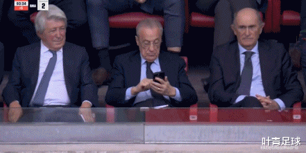 马竞打进第5球,主帅西蒙尼朝着看台疯狂怒吼庆祝。坐在贵宾包厢的皇马主席弗洛伦蒂诺,则面色铁青地看着刷着手机。