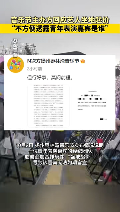 10月2日,@N次方扬州枣林湾音乐节发布情况说明,披露原定参演的一位青年表演嘉宾因经纪团队临时“坐地起价”,最终无法如期官宣,引发行业与乐迷关注。