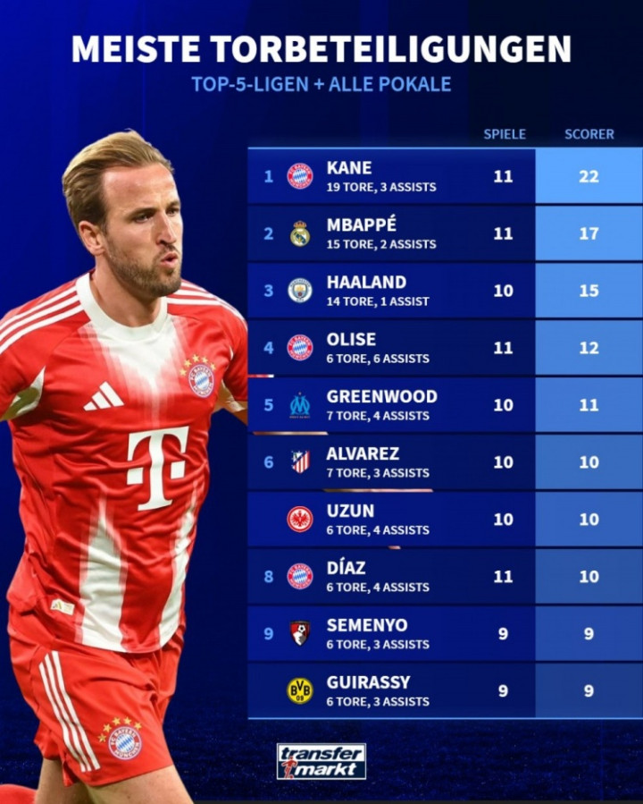 直播吧10月20日讯《转会市场》统计了本赛季五大联赛球员在俱乐部各项赛事的直接参与进球总数情况,凯恩、姆巴佩、哈兰德分列前三。