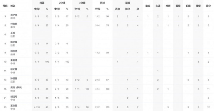 辽宁全运女篮,吴爽11分,王秋懿12分7篮板。