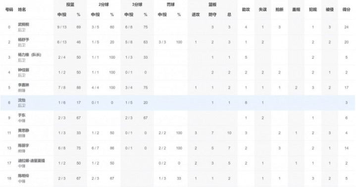 数据统计方面,广东全运女篮,武桐桐24分3篮板4助攻3抢断,杨舒予20分3篮板,李嘉琳17分,陈丽宇14分7篮板。